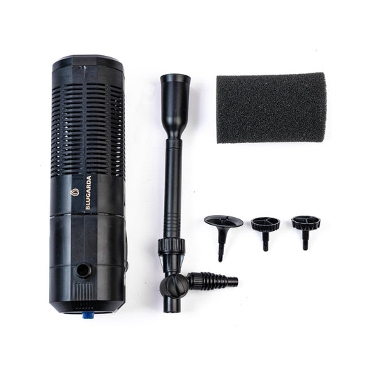 BluFilter är ett allt-i-ett set för filtrering och rengöring av dammvatten. Filtersystemet har inbyggt filtermaterial, en inbyggd pump och en inbyggd UV-C lampa och optional fontänset. Du behöver inte köpa någon extra dammpump, fontän eller UV-C lampa för att få setet att fungera. Detta gör det till en billig allt-i-ett lösning för din damm.
