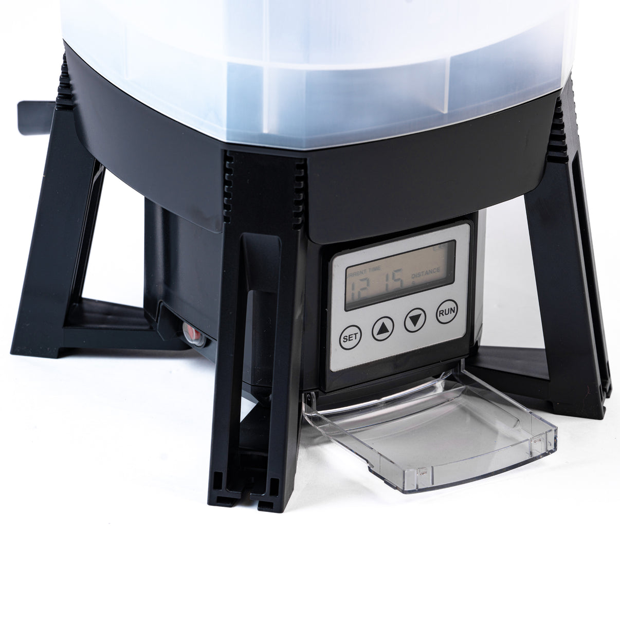 Ingenting är värre än foder som blir blött av regnet. Foderbehållaren är hermetiskt tillsluten på ovansidan. Så regn kan inte komma in i foderbehållaren. Utlöpet är täckt så att regn inte heller kan komma in från sidan. Kontrollpanelen är skyddad med ett lock så att knapparna inte blir blöta eller smutsiga.