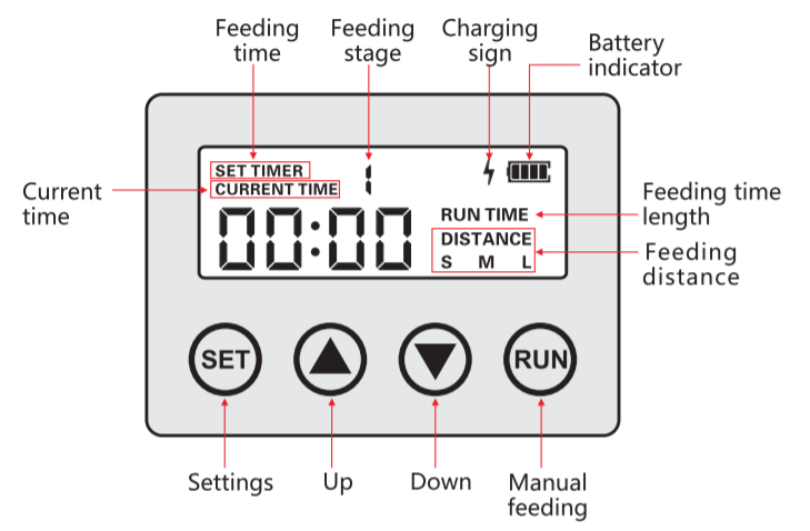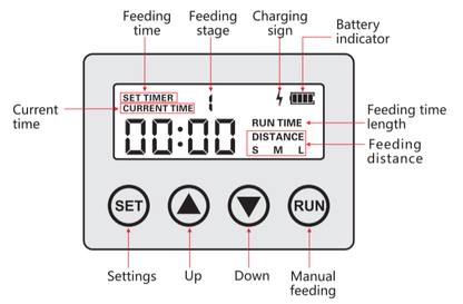 Varje damm är annorlunda och varje behov av fiskfoder för en damm är annorlunda. BluFeeder har många inställningsmöjligheter via den lättanvända kontrollpanelen. Du kan själv ställa in hur ofta du vill mata fiskarna per dag, upp till 6 gånger per dag. Dessutom kan du ställa in hur långt fiskmataren ska kasta fodret. Räckvidden kan ställas in på 1, 2 eller 3 meter. Så du kan anpassa räckvidden efter storleken på din damm. Även mängden per cykel kan ställas in. Du kan ange matningstiden mellan 1-20 sekunder. Så du kan anpassa hela matningen efter dina fiskars diet.